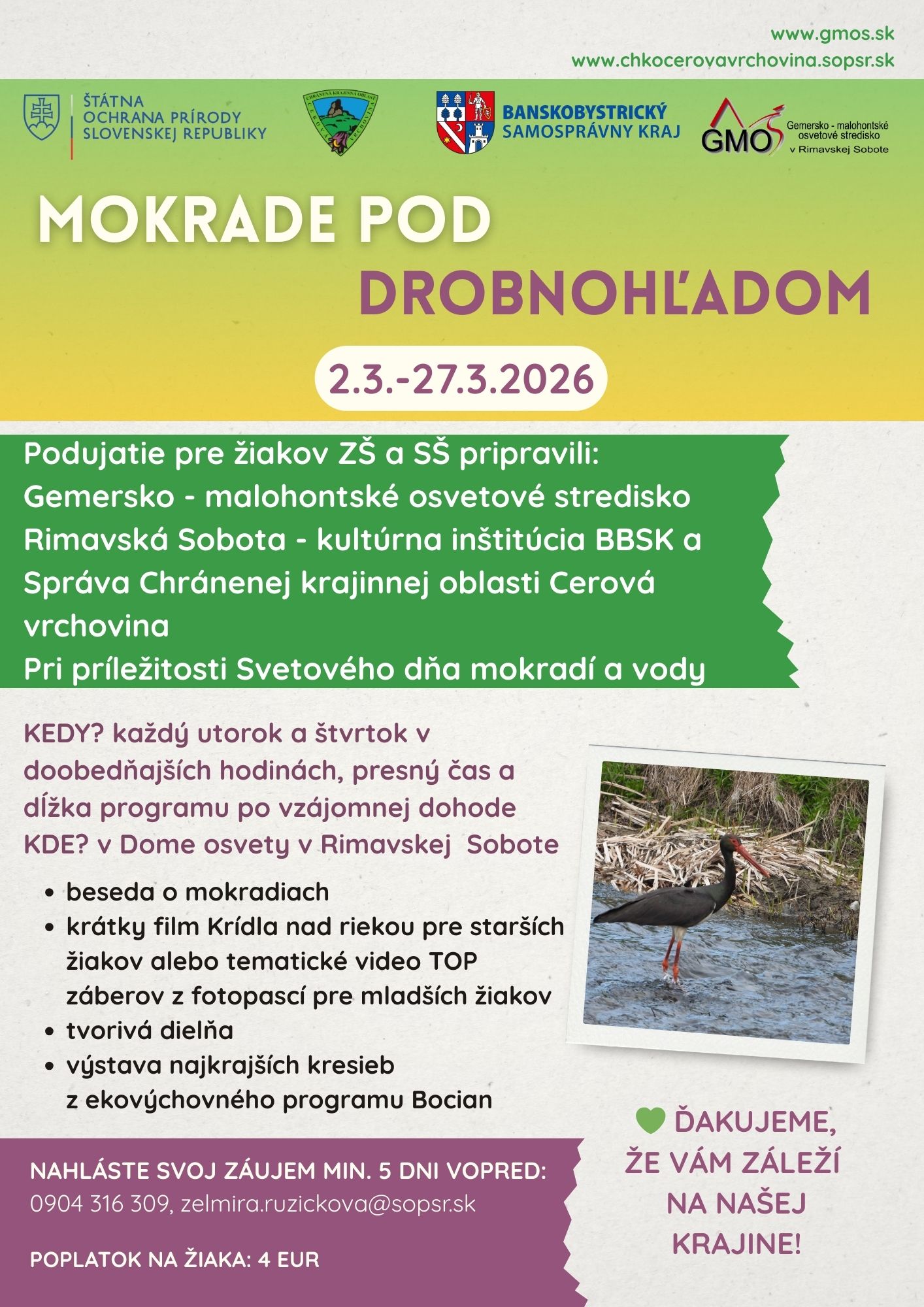 Pozývame žiakov základných a stredných škôl na podujatie venované mokradiam a vode s pestrým programom, doplneným o výstavu najkrajších kresieb z Ekovýchovného programu Bocian.